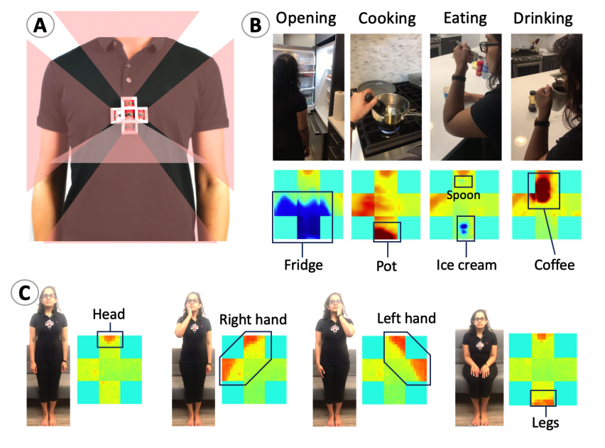 HeatSight is (A) a chest-worn wearable system consisting of five independent low-power thermal sensing arrays allowing a thermal Omni capture (180◦) of the wearer’s surroundings, including (B) the thermal radiation emitted from objects around the wearer, and (C) the human thermal signature emitted from the wearer’s body over time. These thermal human-object interaction signatures can be used for human activity detection.